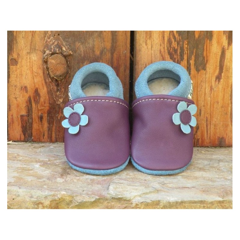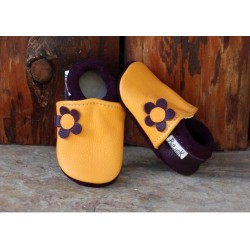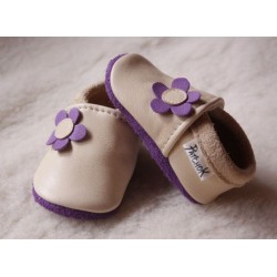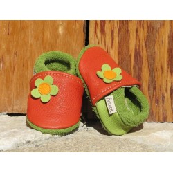 Ces chaussons en cuir souple pour bébé, arborent 2 fleurs colorées. Ils sont fabriqués en France, en Ariège et cousus dans du cuir tannage végétal (cuir pleine fleur ECOPELL, certifié NATURLEDER).
