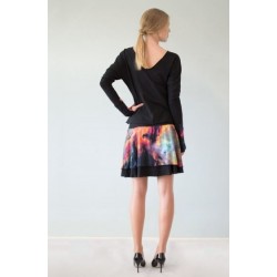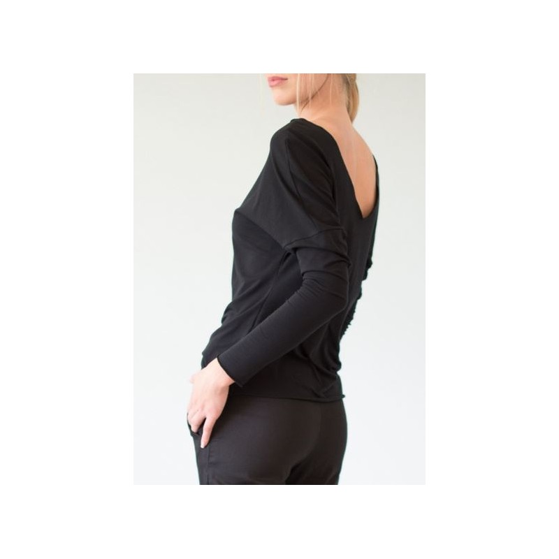 Haut dos nu en jersey de coton bio très doux, encolure arrondie devant et dos en V avec ses manches chauve-souris. Le décolleté s'arrête juste avant l'agrafe du soutient-gorge. Coupe japonisante. Coloris chic noir.