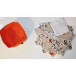 - 10 lingettes en coton et éponge certifiées Oekotex standard 100/1 présentées dans un panier en tissu assorti.