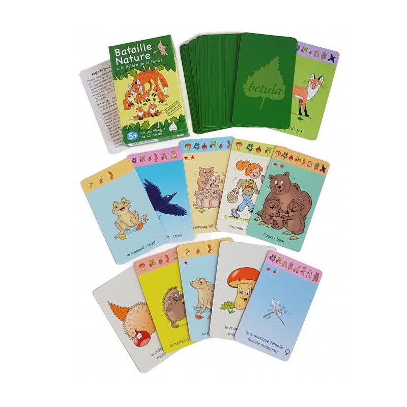Jeu de cartes Bataille Nature Forêt est un jeu très vivant, ludique et pédagogique pour 2 à 3 joueurs. Un jeu de bataille intelligent très apprécié des enfants de 5 à 12 ans. Sur la trame de la chaîne alimentaire, les joueurs posent des cartes et mangent ou se font manger leurs cartes en fonction des relations alimentaires. Mais attention, la ruse est permise et la chance ne suffit pas.
