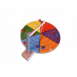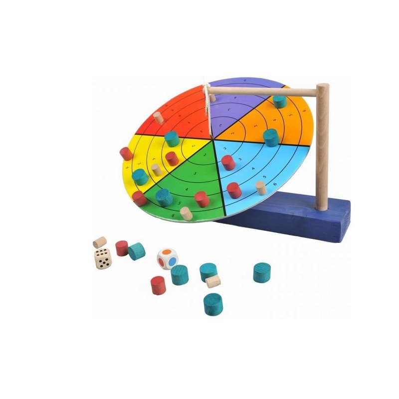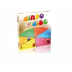 Dingo Disc est fabriqué à 100% en France et contient : 1 disque de 6 couleurs de 30 cm de diamètre environ, 60 pions bois, 2 dés et un livret de règles.