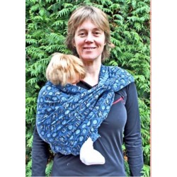 Echarpe porte-bébé, "Echarpô", en coton bio jacquard, tissé et fabriqué en France dans des tons bleus et noirs. Motifs avec ronds bleus et noirs